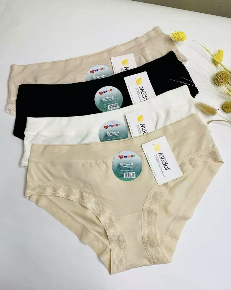 Жіночі трусики із мякого модалу.Гарні приглушені кольори,прикрашені кружевом. В упаковці 12 шт. різних кольорів (зразки кольорів на фото)