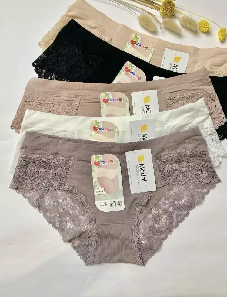 Жіночі трусики із мякого модалу.Гарні приглушені кольори,прикрашені кружевом. В упаковці 12 шт. різних кольорів (зразки кольорів на фото)